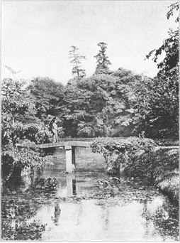 "Tea Gardens" are divided into outer and inner inclosures separated by a rustic fence. The outermost inclosure contains a main entrance gate, and behind this there is often a small building in which it is sometimes the custom to change the clothing before attending the ceremony. The outer inclosure also contains a picturesque open arbor, called the "Waiting Shed," which plays an important part in tea ceremonies, for here the guests adjourn at stated intervals to allow of fresh preparations being made in the tiny tea room. The tea room is entered from the garden through a low door, about two and one-half feet square, placed in the outer wall and raised two feet from the ground, through which the guests are obliged to pass in a bending posture indicative of humility and respect. The rustic well forms an important feature of the inner garden, as do the principal lantern and the water-basin. A portion of the inner inclosure of a "Tea Garden" in the Tamagawa, or Winding-river style, showing the stream, bridge, lantern, water-basin, and an arrangement of stones, including the indispensable "Guardian Stone," is represented in the drawing on this page. All these separate features are connected, according to very rigid principles, by stepping-stones which make meandering routes between them, and form the skeleton of the whole design.