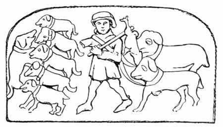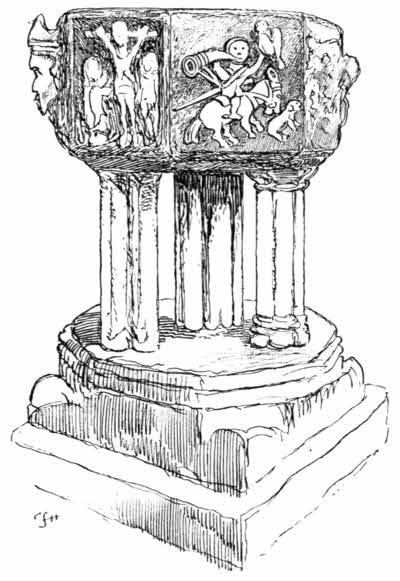 The little church of St. Levan is rich in old bench-ends, displaying his fishes, a palmer with cockle-shells in his hat, knights, ladies, and jesters; while the chancel-screen is enriched with the eagle of St. John, the lily of the Virgin, the sacred monogram, and the spear, nails, and hammer of the Crucifixion. The Virgin herself is rendered, with round silly face and coif and fifteenth-century ruff. There has been a great deal of restoration effected here of late years.