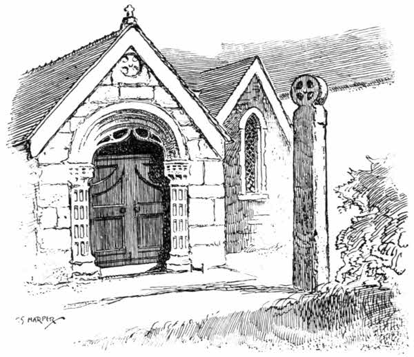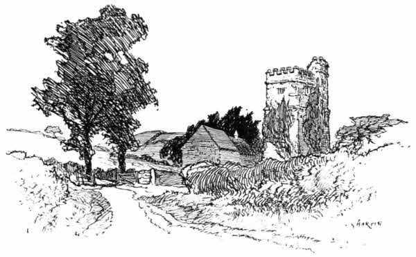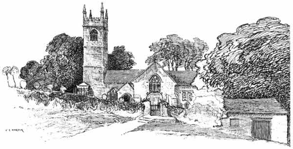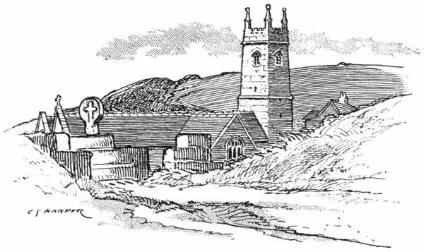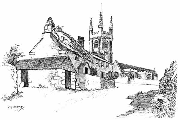 Three miles out from Penzance the road forks. You may go equally well either to right or left. Let us take the left-hand road, through the half-way village of St. Buryan, which itself adds no hospitable note to the scene, but seems to stand on the windy upland as an example of how ashen-hued and weatherbeaten a village may be. The tall, dark church-tower rising from its midst and serving as a landmark for miles, is the most striking feature of the place. St. Buriana, the patron saint, was originally Bruinech, daughter of an Irish chieftain, who adopted the religious life. The existing church, successor of a collegiate establishment founded by Athelstan, the Saxon conqueror of Cornwall, in A.D. 936, stands on the site of her oratory. It was last rebuilt in the Late Perpendicular style prevailing so largely in Cornwall, and is a fine large building. Two ancient granite crosses on steps stand outside; one in the churchyard, the other in the village street.