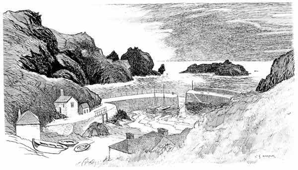 The cliff-paths from Mousehole for Lamorna Cove trend inland through the farm-place of Kemyll Wartha, and then descend steeply to the landward end of the deeply indented little bay, where the sea comes surging in amid great granite boulders, to the grassy and rushy fringe of a brook hurrying down from a valley dense with trees and undergrowth. Commercial activities, in the way of granite quarrying, are evident on the cliffs at Lamorna.