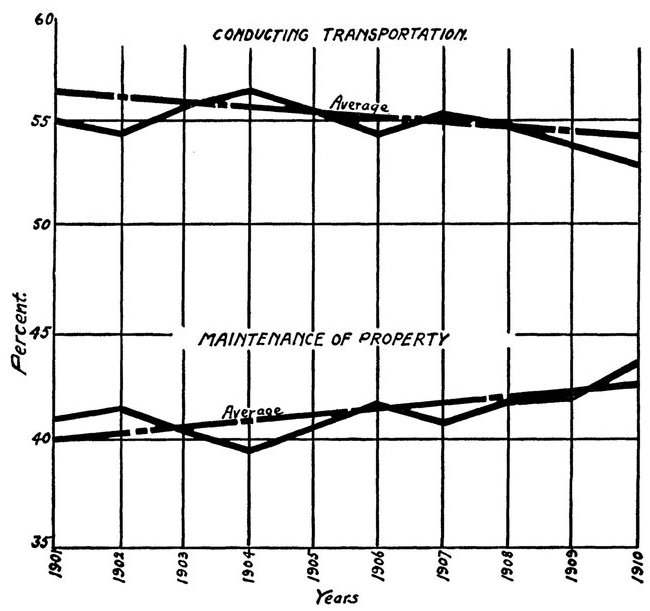 Analysis of railroad expenditures, 44.—Constant v. variable outlays, 45.—Fixed charges, 46.—Official grouping of expenses, 46.—Variable expenses in each group, 51.—Peculiarities of different roads and circumstances, 56.—Periodicity of expenditures, 61.—Joint cost, 67.—Separation of passenger and freight business, 68.