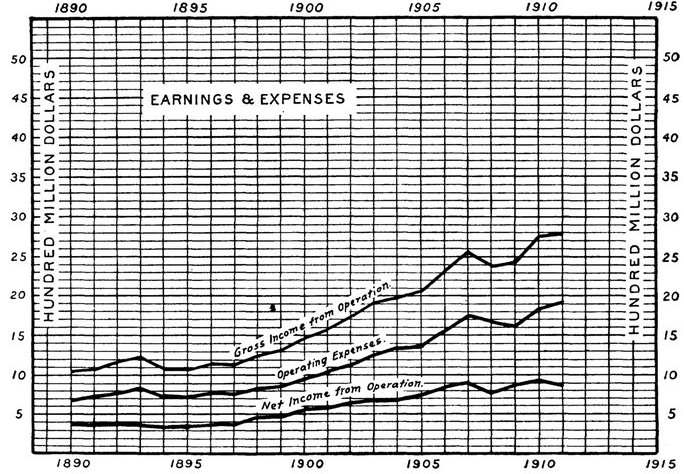 Growth of mileage and traffic in the United States since 1889, 77.—Increase of earnings, 79.—Operating expenses, gross and net income, 80.—Comparison with earlier decades, 85.—Density of traffic, 86.—Increase of train loads, 88.—Limitations upon their economy, 92.—Heavier rails, 93.—Larger locomotives, 94.—Bigger cars, 95.—Net result of improvements upon efficiency and earning power, 97.