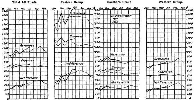 Contrast before and after 1900, 411.—Revenue per ton mile data, 412.—Their advantages and defects, 414.—Nature of the traffic, 416.—Low-grade traffic increasing, 416.—Growing diversification of tonnage, 418.—Present conditions illustrated, 419.—Length of the haul, 421.—The proportion of local and through business, 422.—Effect of volume of traffic, 424.—Proper use of revenue per ton mile, 425.—Index of actual rates, 426.—Its advantages and defects, 427.—Difficulty of following rate changes since 1900, 427.—Passenger fares, 429.—Freight rates and price movements, 430.