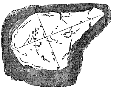“More distant from the cliffs, yet in line with the four already described, is a larger inclosure; the door facing south, and looking toward the strait: this so-called door is simply an entrance made of large stones placed one above the other. The inclosure itself triangular; its northern side about eighteen inches high, built up of flat stones. Some bird bones and one rib of a seal were found exactly in the centre of this triangle, as if a party had sat round it eating; and the top of a preserved-meat case, much rusted, was found in the same place. I « 34 » picked up a piece of canvas or duck on the cliff side, well worn by the weather: the sailors recognized it at once as the gore of a pair of trowsers.