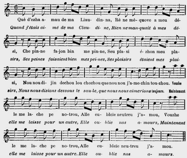 4 Dé mon tourmé pe va ma blonde L'a sheurshezha sè m'arrétau. Pe lamè mamau cha man blanshe De baillezha bin mon grè prau, De l'amou tè que rè su tarra Ne vaut pre ma che n'amitia, Pe la va d'azardezha me n'ama Pe l'a va de vèdra ma via. |