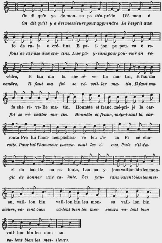 2 Tui leu matin dè la preleia Nou menovin neutreu moton, Me chetova prè de ma meïa, Nou quemèchovin na shèchon, Pi aprè cètië nou dèchovon E nou teniè tui deu la mon, De plasi leu moton chotauvon Mè le ne vin pau mé è shon. |