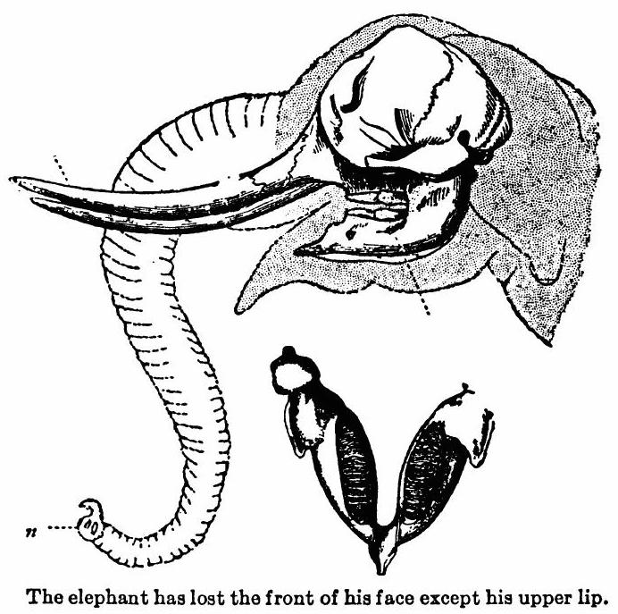 If it is an animal like ourselves, this body stuff, before it becomes a body, is a round ball. A furrow doubles in along the place where the back is to be, and becomes the spinal cord. A rod strings itself along underneath this, and becomes the backbone. The front end of the spinal cord grows faster than the rest, becomes larger, and is the brain. The brain buds out into the eyes. The outer surface of the body, not yet turned into skin, buds inward and makes the ear. Four outgrowths come down from the forehead to make the face. The limbs begin as shapeless knobs, and grow out slowly into arms and legs. Sometimes these make a mistake at their ends, and split into six fingers or toes instead of the customary five. Then if the little creature is a human baby, the Doctor has to cut one of these off; but if it’s a kitten we say it has double paws and will be a good mouser—tho really I don’t suppose it makes the least difference.