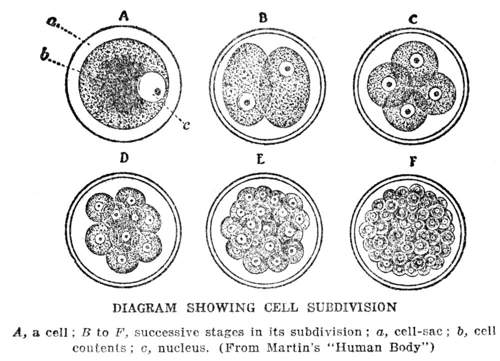 The construction units have been named cells. In some tiny animals the whole body consists of but one cell; all higher animals, including ourselves, have millions of cells making up the body. Undoubtedly some cells are alive; our question is as to whether all of them are, or whether there are some that are alive and some that are not. There are parts of our bodies, and of the bodies of nearly all other kinds of animals, as well, that are certainly not alive. Examples are the hair, the nails, the enamel of the teeth, and the hard parts of the bones. Actual living stuff is very soft and liquid. It is too fragile to hold its own structure except in the very tiniest animals; those that are larger need some additional supporting framework. In a body the size of a man’s the supporting framework amounts to a very considerable percentage of the entire weight (25 per cent). Not only is there the large bony skeleton, but between and among the individual cells is a framework made up of fine fibers and sheets which hold the cells in place. This latter framework is called connective tissue; we run across it in the gristly parts of meat. It makes up the stringy mass that clings to the cutter of the meat grinder when beef is being ground for Hamburg steak. We shall consider later how all this supporting material is made and put in place. Just now we are interested in the cells, and in determining whether all of them are alive or not.