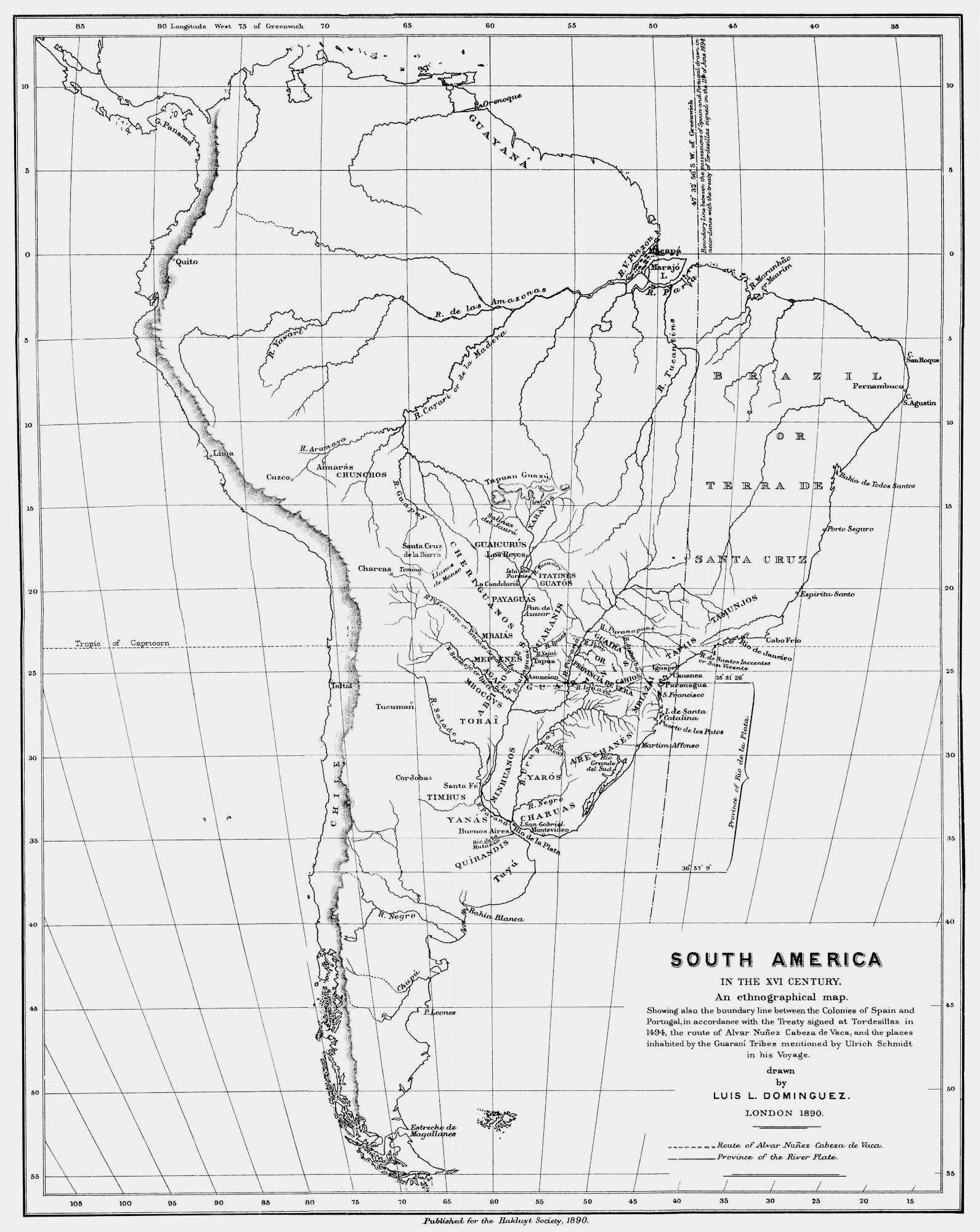 HAVING obtained this information, the governor determined, in accordance with the advice of the officers and clergy and captains, to penetrate into the interior and discover the settlements there, and for this purpose he chose three hundred arquebusiers and crossbowmen. As the country through which they had to pass before they came to the inhabited districts was deserted, he ordered them to take provisions for twenty days. He ordered one hundred Christians to remain in the port to guard the brigantines, with 200 Guaranís, and appointed Captain Juan Romero to be their commander, for he knew the country. We left the port of Los Reyes on the 26th November 1543. All that day we marched through cool and shady forests, following our guide by a little frequented path. That night we rested by the side of some streams of water, and the following morning, one hour before daybreak, resumed our journey, sending twenty men in advance with the guide to clear the road; for the further we went the more closed we found it by trees and high, thick weeds, rendering it very difficult to penetrate into the interior. That same day, at five o’clock in the evening, we halted to pass the night by the side of a great lagoon, where the Indians and Christians caught fish in their hands. As we advanced, we ordered the guide to climb the trees and hills to reconnoitre, and make certain we were on the right road to the inhabited country.