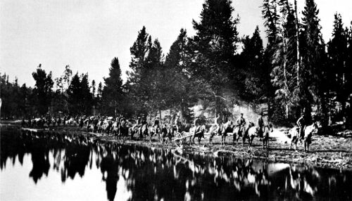The Hayden Survey, led by Lieutenant Gustavus C. Doane, about to enter the Yellowstone area. The two-wheeled vehicle, in the center foreground, is an odometer, a horse-drawn device used to measure distances travelled in the wilds.