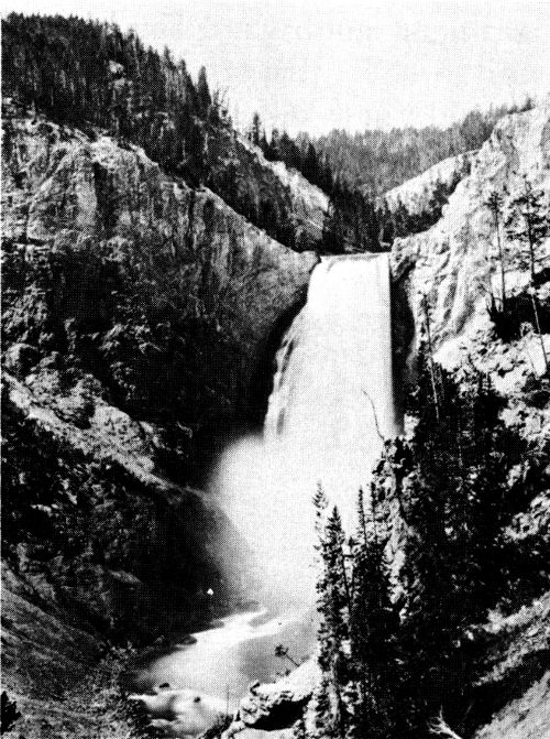 Lower Falls of the Yellowstone. A more distant view of the falls. The photograph however, conveys but a dim conception of the ruggedness of the surroundings.