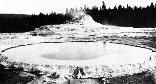 Hot Springs and Castle Geyser. The spring in the foreground is in all respects the most beautiful one in the National Park. The ornamental rim is nearly circular, being about twenty-two feet. The depth is unknown. When the rays of the sun fall nearly vertically on the almost unnaturally transparent waters, all the colors of the prism are produced. The temperature is about 180°. Just in the background is the Castle Geyser, which is so called from the form of its crater. It is really an old ruin. It seldom plays, but when in operation it is a terrific power, shaking the ground for a considerable distance. It continues with great force for one to two hours.