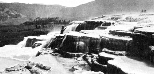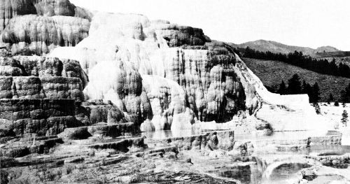 Mammoth Hot Springs, Lower Basin. The four succeeding pictures represent the calcareous group. There are two kinds of hot springs in the park, called siliceous and calcareous from the character of their deposits. A large amount of lime is held in solution in the hot water which is precipitated in wonderfully unique architectural forms on the steep sides of the mountains, as shown in the photograph. These springs are located in the valley of the Yellowstone, near the northern boundary of the park, and are named White Mountain Hot Springs on the map. At the present time they are most accessible by the way of Fort Ellis, Montana, and the Yellowstone Valley.