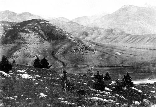 Panoramic View of the Valley of the Yellowstone. This group of three pictures from a panoramic view of what is regarded by visitors to that region as the most beautiful and symmetrical range of mountains in America. The summits of the peaks are covered with snow more or less the year round, and can be seen for eighty to one hundred miles in every direction.