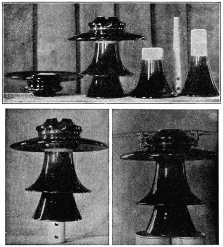 Insulators for the transmission line, which are illustrated in Fig. 104, are of brown, glazed porcelain, made in three parts, and cemented together. The three parts consist of three petticoats or thimbles, each of which slips over or into one of the others, so that there are three outside surfaces and three interior or protected surfaces between the top of an insulator and its pin.