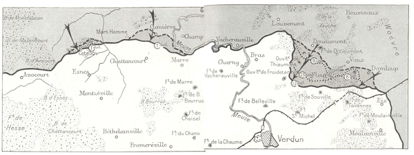 On September 20th, the third Bavarian Corps attacked the 75th reserve division, advanced rapidly on the 22nd as far as the line Combres-Vigneulles-Thiaucourt (p. 9) and bombarded the forts of the Hauts-de-Meuse. This line was defended by mobile troops outnumbered by two to one.