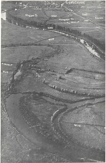 From October 28th 1914 to March 1st 1915, four attacks were launched against Vauquois, the summit of which was reached by the French troops of the 10th Division. The struggle extended around the mine craters until 1916. (See page 144.)