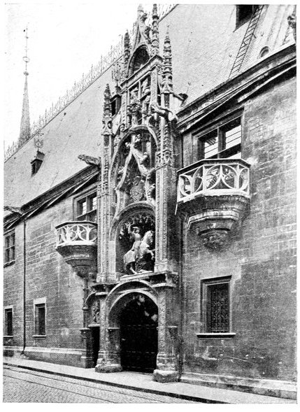 From the gates of the Keyserhof, through the narrow streets of the old Flemish city, the long procession wound its way: Knights of the Golden Fleece, nobles, deputies, Bishops and clergy, merchants, artisans, and beggars, all clad in deep mourning. Twelve heralds, followed by a crowd of gentlemen with lighted torches, bore the armour and banners of the dead King to the portals of S. Rombaut. There an immense catafalque, draped with cloth of gold and blazing with wax lights, had been erected in the centre of the nave. Three golden crowns, symbols of the three realms over which Philip held sway, hung from the vault, and the glittering array of gold and silver images on the high-altar stood out against the sable draperies on the walls. A funeral oration was pronounced by the late King's confessor, the Bishop of Arras chanted the requiem Mass, and when the last blessing had been given, Golden Fleece threw his staff on the floor, crying: "The King is dead!"[2] At the sound of these thrice-repeated words the heralds lowered their banners to the ground, and there was a moment of profound silence, only broken by the [Pg 3]sound of weeping. Then Golden Fleece cried in a ringing voice: "Charles, Archduke of Austria!" and all eyes were turned to the fair, slender boy, who, robed in a long black mantle, knelt alone before the altar. "My lord lives! long may he live!" cried the King-at-Arms; and a great shout went up on all sides: "Long live Charles, Archduke of Austria and Prince of Castille!" A sword blessed by the Bishop of Arras was placed in the boy's hands, and the heralds of Burgundy, Flanders, Holland, and Friesland, raising their fallen pennons, each in turn proclaimed the titles of the youthful Prince, who was to be known to the world as Charles V.