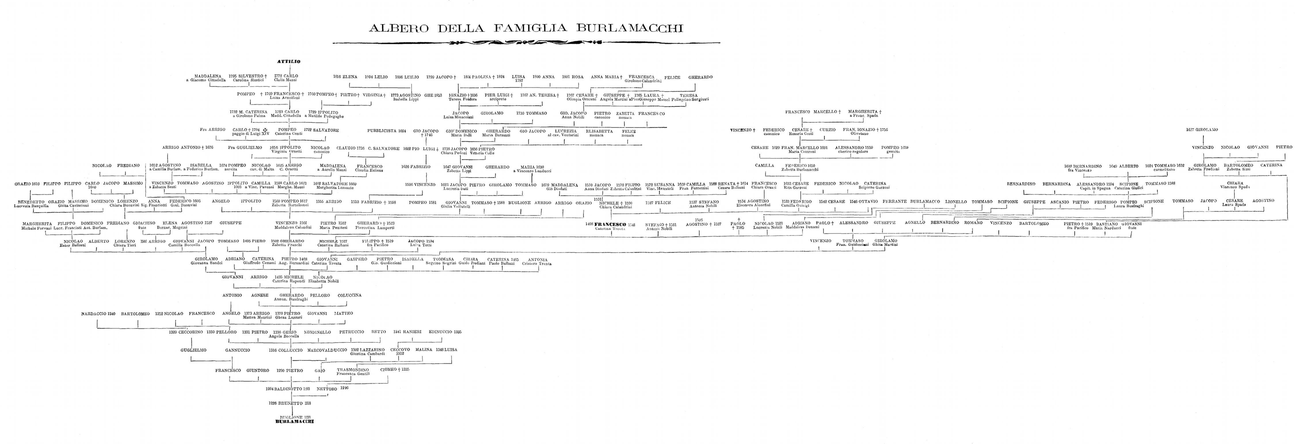 Tornata in patria la famiglia Burlamacchi, occorre sempre ammessa al governo della Repubblica ed insignita di uffici e di onori non solo prima di Francesco, ma anco molto tempo dopo, come ricavo da certo albero genealogico che ho per mano, il quale mi mostra un Paolino morto nel 1824, e tengo per certo che ogni fiato di lei non sia anco spento. Il Penintesi nelle Memorie[7] intorno alle principali famiglie di Lucca ci [24] afferma che ai suoi tempi quella dei Burlamacchi annoverava non meno di quaranta gonfalonieri e centottanta anziani, fino d'allora la rendevano preclara parecchi oratori spediti alle più cospicue corti di Europa, non pochi cavalieri di Malta, col solito corredo di ecclesiastici, i quali (come si sa) furono tutti matricolati per pietà e per dottrina preclari, almanco a detta di chi scrisse di loro.
