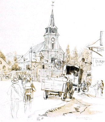 After work the divisional motor transport lorries return methodically to their own parks. During long journeys they rest now and then, tucked into the right of the road or standing in a market place, while the men eat their haversack rations. Mixed with the lorries here are their seniors, the covered vans of French country carriers and, still older, the long, low, French farm wagons now drawn by horses, but built, as is shown by the very low pole, for draught oxen. In the market place there wait also the cars of British staff officers visiting the town. The handsome building in the background has its red-brick façade set off with alternating square bosses of white stone, on each side of the windows, after the custom of 17th and early 18th century builders.