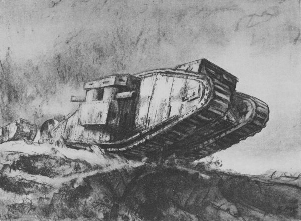 Thanks to the imaginative power of the artist, the “Tank” is here seen not as the British soldier sees it—a friendly giant with lovably droll tricks of gait and gesture—but as it must look to a threatened enemy, the very embodiment of momentum irresistibly grinding its way towards its prey. In the presence of “tanks” as here drawn—though there is no trace of exaggeration in the drawing—the spectator is as a crushed worm and, in fact, finds there is more force in that phrase than he knew.