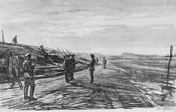High ground near “King George’s Hill,” whence the King viewed the main battlefield of 1916; the drawing shows this in the distance. The foreground was won last July by the Manchesters. They found in No Man’s Land the bodies of many Frenchmen killed in earlier fighting, and buried them beside their own dead. Not all the bodies could be identified: Some of the crosses shown in the drawing bear such inscriptions as “In honoured Memory of Two Unknown French Soldiers, buried here.”