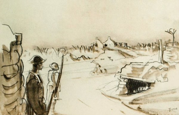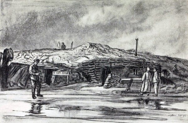 The second drawing, with a helmeted sentry at the sand-bagged entrance to a dug-out, conveys the sinister air of a village destroyed, but not quite effaced, by shell-fire.
