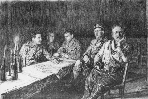 The Officers’ mess at the most advanced station of the Royal Flying Corps on the Somme front. The great tent was designed as an aeroplane hangar. An R.F.C. mess usually has an atmosphere of its own. There is more variety of apparel than at other messes; there are more dogs; personal mascots abound, and in many ways there is more expression of individual choice or peculiarity than elsewhere—corresponding, perhaps, to the more individual character of a flying officer’s work and responsibilities and to the temperament which leads to success in flying. The officers are drawn from all sorts of regiments, and each continues to wear his regimental badge. It is winter, and the second figure from the left is wearing a fur jacket.