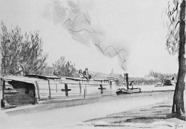 As you walk southward from Amiens, across meadows and cornfields, the ground rises more gently than the immediate south bank of the Somme, on which the Cathedral and the City stand. Thus the city sinks gradually out of sight until nothing is left but the thin Cathedral spire, looking like the mast of a sunken ship. Mr. Bone’s drawing was done from a point, about a mile south of the city, at which the Cathedral roof, the tower of Saint Martin’s Church, and one or two factory chimneys are still unsubmerged.
