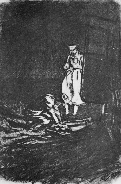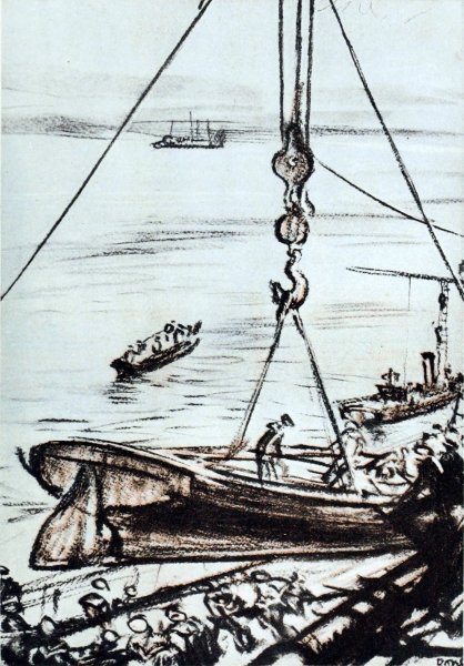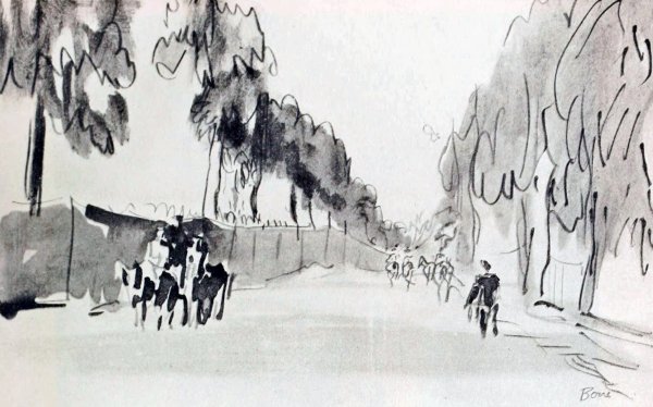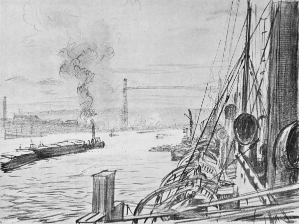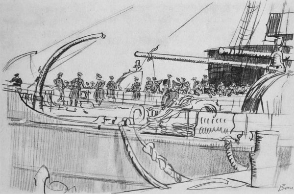 Few officers or men from the western front can visit the Fleet; but the winds of chance, which blow casualties and convalescents all about Great Britain, drop a few of them down in spots where the Fleet, as Mr. Bone draws it, is under their eyes. Drawings like those of “A Fleet Seascape” (LXXXIX) and “A Line of Destroyers” (LXXXVI) awake recollections of guard duty in a small Scotch fishing village; of the majestic seaward procession through the midsummer night, before the battle of Jutland; of the return from the fight, the destroyers streaming tranquilly back to their moorings under the hill, with the great searchlight wheeling to and fro along the sea outside them, like a sentry moving alertly on his post; a few wounded ships steaming in more sedately, or taking a tow, one with a couple of funnels knocked out of the straight, another with a field-dressing of bedding stuffed into a hole in her side, and the whole wound, apparently, smeared with red paint, as the surgeons smear flesh wounds with yellow; and then of the coming181 ashore, the men triumphant and happy, the officers learning with astonishment and indignation that people at home had heard more of losses than of the victory.