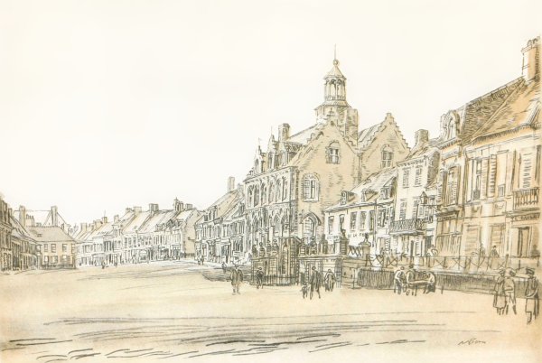 Cassel has no great part in this war. But it has endured ancient sieges; three notable battles have taken its name since 1070; the last of them led to the annexation of Cassel to France in 1678 and gave her a town finely set on a hill amidst lowlands, and equally good to look at and look from. The many windmills about it give Cassel an air of liveliness as you approach, and this cheerful effect is maintained on reaching the main square, drawn by Mr. Bone, with its lightsome spaciousness and comfortable, well-proportioned houses. The eyes of passing Scottish soldiers find a familiar look in the “step” gables of many of Cassel’s roofs. One is seen on the right.