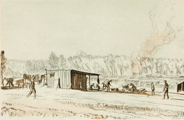 In this one drawing may be seen the face of all the hard-fought woods of the Somme battlefield—Mametz, Fricourt, Bazentin, Delville, Thiepval, Foureaux and St. Pierre Vaast. Everywhere in them all there is the same close network of half-filled trenches, the same bristle of ruined tree trunks, the same litter of the leavings of prolonged fighting at close quarters—bits of broken rifles and bayonets, perforated helmets, unexploded hand grenades, fragments of shell, displaced sand-bags, broken stretchers, boots not quite empty, and shreds of uniform and equipment.