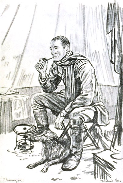 It is always cold in an aeroplane in flight, but in winter the cold endured by airmen is often atrocious, however perfect their equipment. A pilot, who has just come down from his three hours of duty in the air, is here seen “thawing out” over a spirit stove in his tent. Like the thawing of meat taken from cold storage, the process requires some patience.