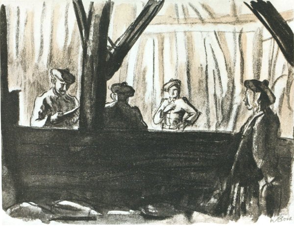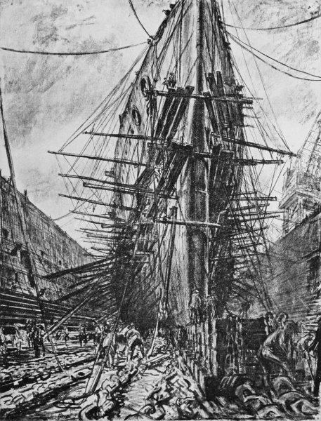 Mr. Bone’s drawings give an insight into the world of the Navy to which these random glimpses can add nothing. “H.M.S. ‘Lion’ in dry dock” (LXXXIII) is wonderful, technically—if a layman may judge—and in spirit. A whole aspect of modern naval life is lit up by “A boiler-room on a battleship” (XCIII). For, to the astonished landsman visiting a man-of-war, the sailors of to-day seem to work and eat and sleep in a variety of engineering laboratories, surrounded by countless wheels, handles, buttons and bells for the evocation or dismissal of the genies of steam, petrol and electricity. Nothing could be more unlike the lower decks of seventeenth and eighteenth century battleships as we imagine them. The only things which have not changed, from the days of Drake to those of Hawke, and from Nelson’s time to Beatty’s, are the hereditary instinct for the sea and the fine fighting temperament of officers and men.