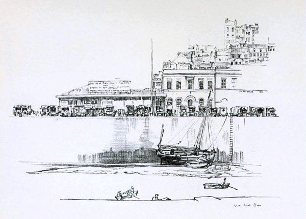 Dead low water in Boulogne Harbour, and a slack time for the motor ambulances parked on the quay above. The work of the R.A.M.C. inevitably comes in rushes, with lulls in between. The great thing is, when a rush comes, to treat every case with a rapidity exactly proportioned to its urgency, removing instantly to the base hospitals or to England every serious case which will be the better, or none the worse, for a slight delay in operation. To work this system perfectly there must always be in readiness, at every point where wounded are entrained or transhipped, a supply of ambulances equal to the maximum call.