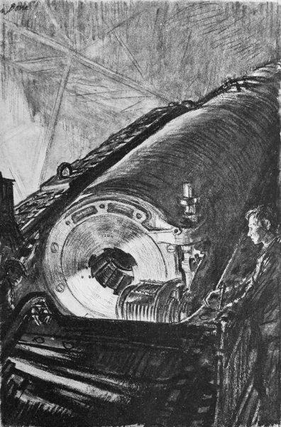 All this turning of tables has been brought about by one cause, in the sense that if that cause had been absent, the care and skill of the finest leaders, the daring of all our airmen, the staunchness of all our infantry would have been strength to no purpose. Munition workers have woven the curtain of smoke that our gunners now draw between our advancing troops and the eyes of their enemy. It is munitions that, thrown from our howitzers, make level roads through the tangles of wire on which, in the old days, the corpses of whole platoons of our men were hung up to rot and look, from far off, like washing put out to dry on thorned hedges. It is munitions that, when we attack, hold back the hostile supports behind a wall of falling bullets as hard to pass as Adam found the flaming sword at the gate. It is, then, not without reason that in this sheaf of drawings of the war on the Western front are included some drawings of guns and shells in the making. They are drawings of victory in the making, and of the saving of hundreds of thousands of British lives.