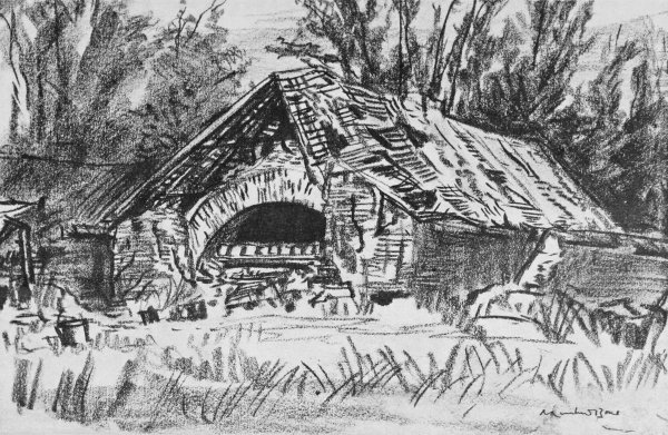 A stretch of high-road which was under enemy observation when drawn. Such roads are, of course, only used with due caution. The whole drawing is remarkably instinct with the artist’s sense of a malign invisible presence—a “terror that walketh by noonday”—infesting the sunny vacant length of the forbidden road.