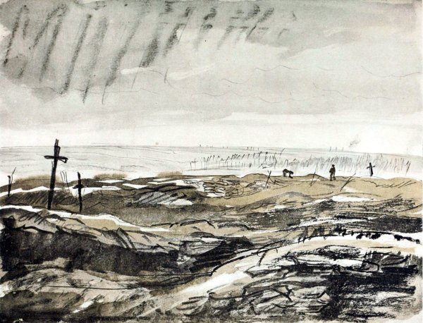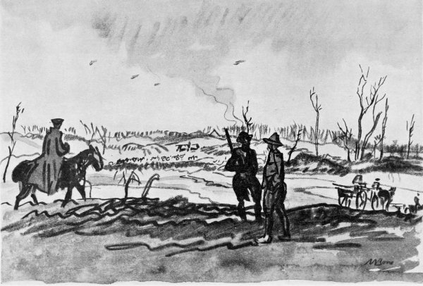 The drawing expresses well the singular aspect of the parts of the battlefield where artillery fire was heavy and where the conical holes made in the ground by high explosive shells were consequently close together. At a later stage these separate pock-marks overlap, like the pits in confluent small-pox, and the whole of the shelled ground becomes soft and loose, as though raked deeply but unevenly. In the distance the detached higher puffs of smoke from bursting shrapnel are distinguishable from the rising clouds of smoke from high-explosive shells.