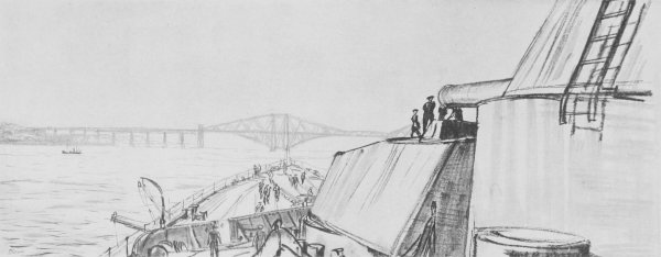 Britain has many beautiful estuaries, but the Forth has features like the distant Highland hills and its enormous Bridge which make it unique among our waterways. The Bridge makes even the largest warship seem a pigmy, yet one has a queer sensation when about to pass under it for the first time; one momentarily expects all the ship’s top hamper to be carried away—everything about the Bridge being on so big a scale that what is safely distant seems perilously close.