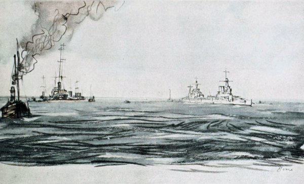 To the left a group of destroyers are gathered round a parent ship. To the right is the beginning of an imposing line of battleships.