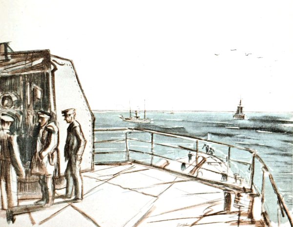 Leaving a French base port. The artist has contrived to suggest in his drawing of the homeward hastening leave-boat the happy eagerness with which the eyes and minds of all on board are turned westward. The slower hospital ship is just leaving the harbour. There is no possibility of any honest failure to distinguish, by day or night, the black painted lightless transport from the hospital ship with its gleaming white and light-green paint and its festal-looking tiers and crosses of scores of brilliant green and red lamps.