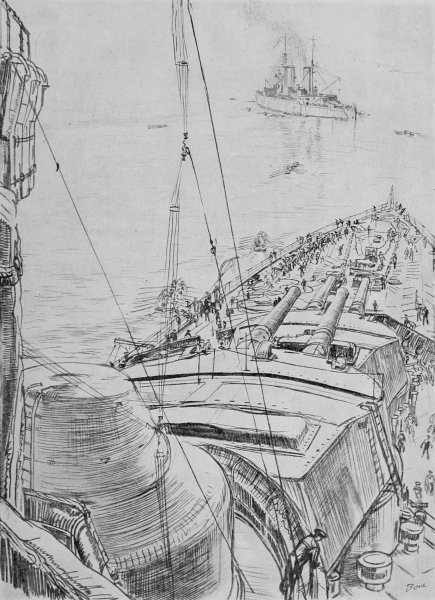 The crew of a Battleship at “General Drill” on a brisk spring morning is an exhilarating sight to the spectator posted at a quiet corner well out of the way. The band of the Marines plays, and the maximum of everything possible seems to be going on at once. In the sketch the ship’s boats have been launched and are making their way with steady stroke out to a neighbouring ship and back.