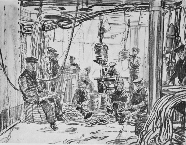 This is Jack at his handiest, especially from the Army point of view. The party are using spare time to make “grommets” of rope-work to go round the bases of 9.2 shells. Not many people, even in the Army, know that the Army have come to look to the men of the Fleet for a great supply of these necessaries.