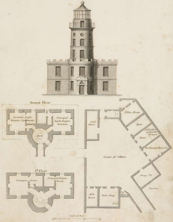 Light-Keepers’ Houses.—The other side of the Plate is occupied with a plan and elevation of the light-keepers’ houses; but as the apartments are respectively marked, it seems unnecessary to enter farther into particulars, than to notice that each family has three rooms, with other conveniencies. Connected with this establishment, there is also a signal-room at the top of the tower, represented in the elevation, where a five-feet achromatic telescope is placed upon a stand. On the roof a flag-staff is erected, and here the signals made by the light-keepers at the Rock are watched and repeated. On the opposite side of the small court formed by these buildings, there is a range of houses for stores, and accommodation for the seamen belonging to the Bell Rock Tender. The whole occupies a piece of ground extending to about one-third of an acre. While the works were in progress, the large telescope was placed at one of the attic-room windows of Provost Balfour’s house, which commands a view of the Rock, as may be observed from the Plate.