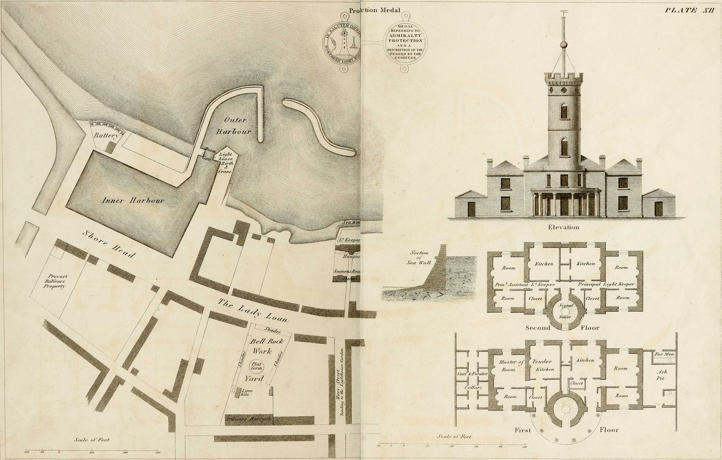 Work-Yard.—The left-hand side of this Plate is occupied with a plan of the harbour of Arbroath, shewing the relative positions of the Bell Rock work-yard and light-keepers’ houses.