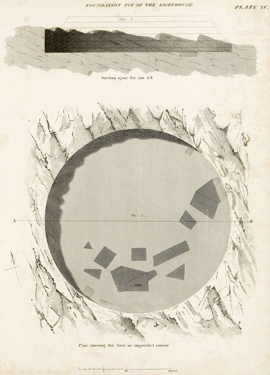 As the ground or imperfect course of the building could not be ascertained till towards the second year’s work, when the site of the Light-house was excavated, this course is represented in Plate XV.
