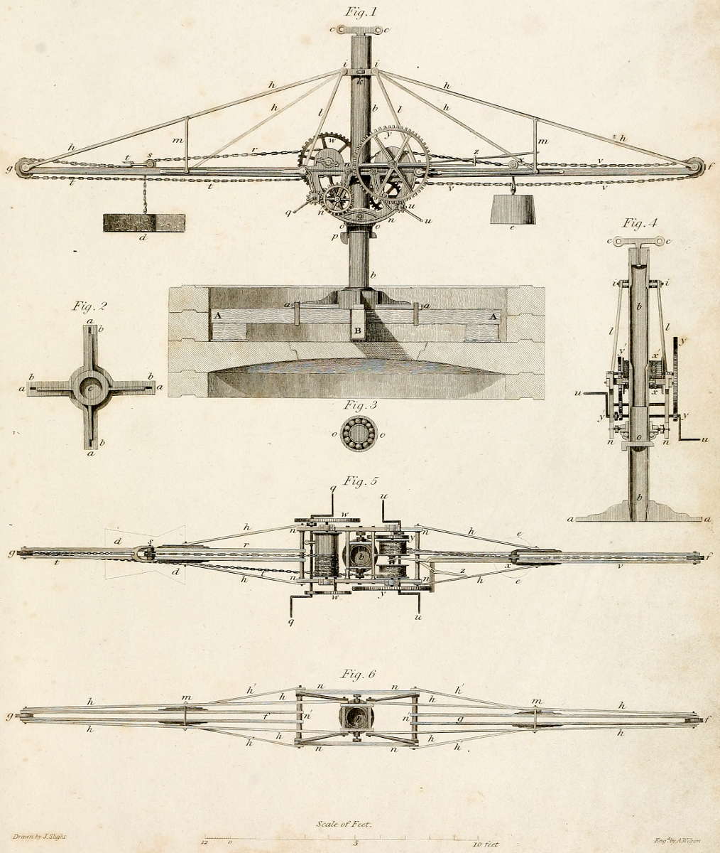 Fig. 5. is a plan of the body of the Crane, in reference to Fig. 1. b is a cross section of the central column, seen in connection with the upper collar d d; with a stone suspended from the end of the main-beam; e e the back weight suspended from the balance-beam: f and g the extremities of these two beams; h´ h´ h´ h´ four horizontal braces, extending from the cast-iron cheeks to the middle of the beam. Letters n n n n the cast-iron cheeks of the body; q q the main purchase-handles; r the main-purchase chain; s its traveller; t t the traveller-chain; u u the traveller handles; v the balance traveller-chain; x its traveller; w w the main-purchase wheels; y y the traveller wheels; z the lever, for stopping the main traveller-wheel.