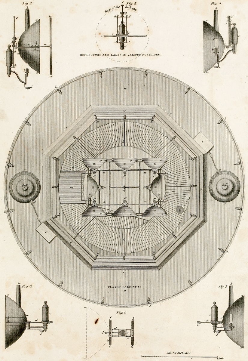 Fig. 1. a a represent the Balcony or walk round the exterior of the Light-room; b b, &c. the brass bats, made in the form of the paw of an animal, are used for supporting the balcony-rail; c c the two Alarm-Bells; d d the hammers by which they are tolled, during the continuance of foggy or stormy weather; e e the case for defending the levers which work the hammers; f f f the stone parapet-wall of the Light-room, of an octagon form on the outside, and circular within; g g g the cast-iron sill of the lantern; h h, &c. the angular cast-iron pillars or mullions, formed by the junction of the contiguous parts of two of the sash-frames; i i, &c. the smaller upright bars, forming the astragals or principal divisions of the sash-frames; k k, &c. the grated cast-iron trimming-path; l the smoke-tube, leading from the kitchen through the cupola or roof; m the trap-ladder leading from the light-room-floor to the trimming-path; n n the reflector frame or chandelier, on which are seen 8 of the reflectors marked o o, &c. with their oil-fountains p p, &c. the whole being framed or built upon the moveable upright-shaft q.