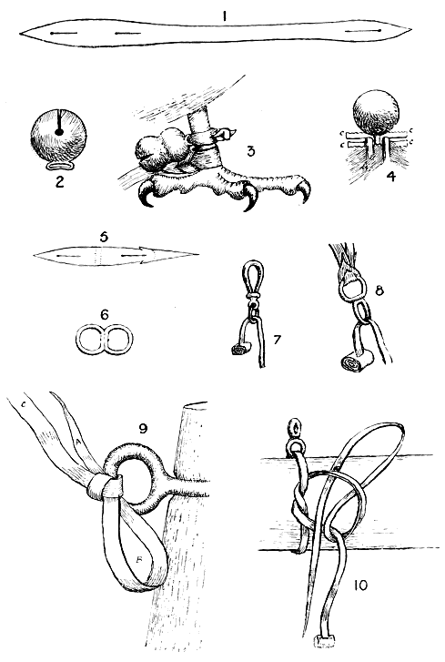 | Jesses—Bells—Swivels—Leashes—The screen-perch—Blocks— Bow-perches—Hoods—Brails—The bath—The lure—Cadges— Gloves—Mews | 40-54 |