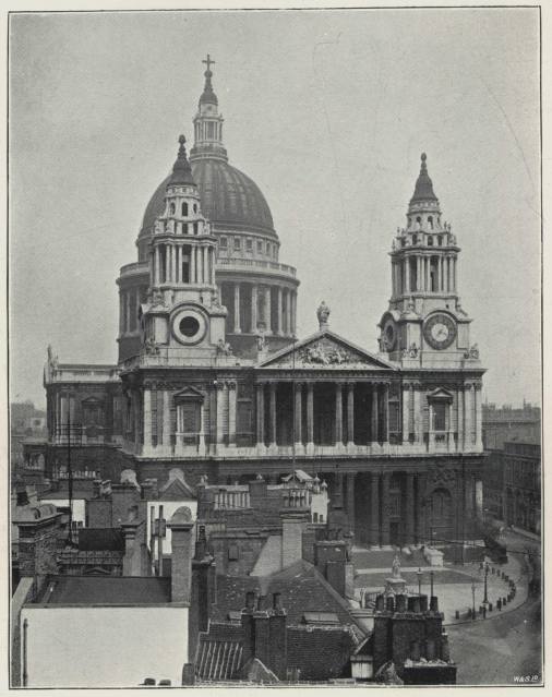 This fine view was taken from the top of the buildings of the Post Office Savings Bank in Queen Victoria Street: taken, fortunately, before the erection of the large block of warehouses at the south west of the Churchyard. Since these buildings have been completed the lower part of the Cathedral can no longer be seen from the position just indicated. The exquisite proportions of the Dome are here displayed to the fullest advantage.